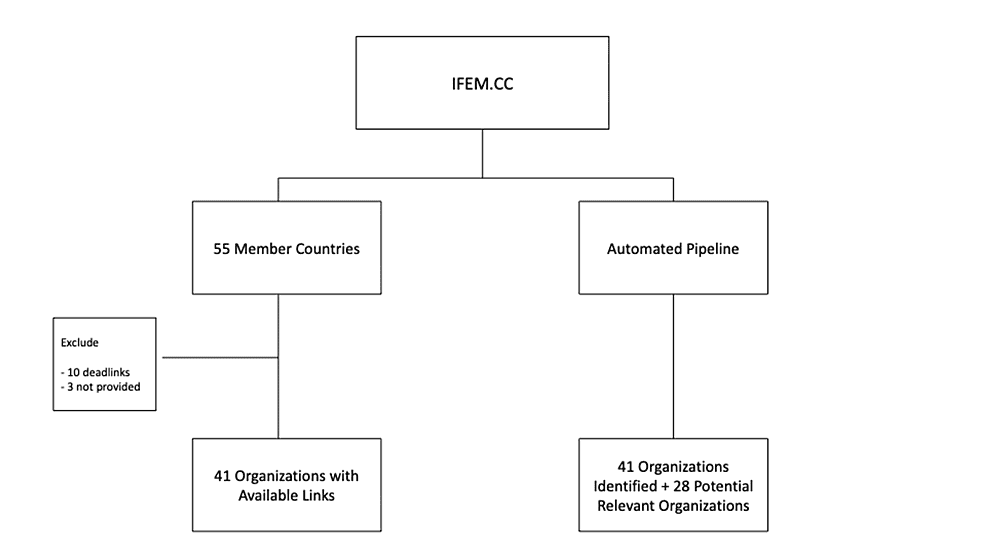 We conducted a manual assessment of the members listed on www.ifem.cc and compared these with results from an automated approach. We used accuracy as the primary metric and the manually assessed results served as our benchmark. Accuracy was calculated by dividing the number of correctly identified relevant URLs by the total number of URLs assessed. This metric as chosen for its interpretability and relevance for initial validation of the automated pipeline. All statistical analyses were conducted in Python version 3.11.7